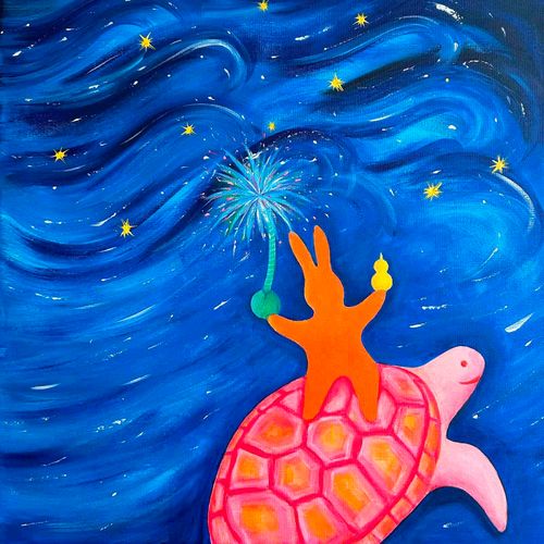 Carrying a gourd and a palm tree, Orange Rabbit moves forward fearlessly in between the waves.